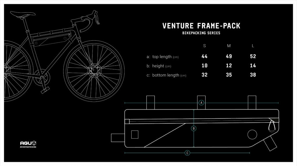 De AGU bikepacking set bestaat uit een stuurtas, zadeltas, toptube en frametas. Deze set is waterafstotend en ideaal voor de beginnende Bikepacker. Opzoek naar 100% waterdichte tassen bekijk dan de AGU Extreme lijn. Met deze set kun een ruime hoeveelheid bagage meenemen. De totale inhoud van deze tassen set is ongeveer 25 liter. De frame tas is er in verschillende maten. Kijk voordat je besteld even naar de maattabel.